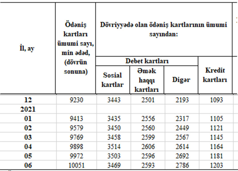 İlk 6 ayda (yanvar-iyun dövründə) sosial kartların sayı 26 min ədəd, əməkhaqqı kartlarının sayı 92 min ədəd, sosial və əməkhaqqı kartı olmayan digər debet kartlarının sayı 593 min ədəd, kredit kartlarının sayı isə 110 min ədəd artıb.
