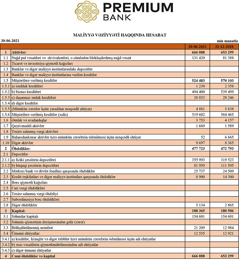 2021-ci ilin 6 ayında "Premium Bank” ın cəmi aktivləri 12 milyon 789 min manat artaraq 30 İyun 2021-ci il tarixində 666 milyon 88 min manata çatıb. Aktivlərin artması nağd pul vəsaitlərinin artması ilə əlaqədardır.
