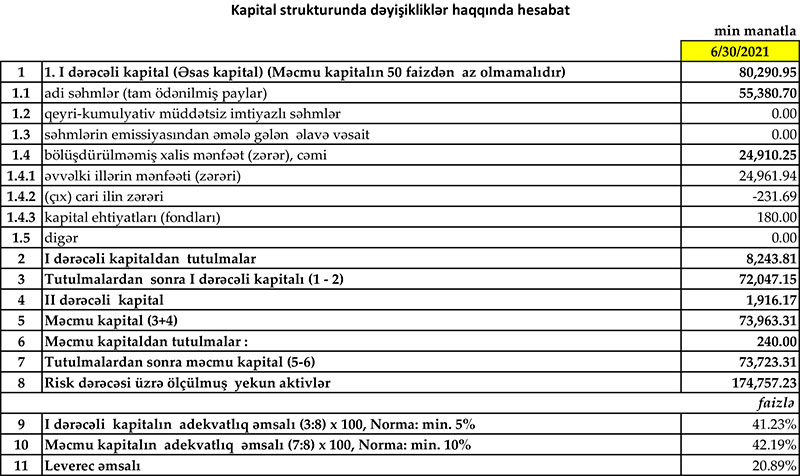 2021-ci ilin ikinci rübünün nəticələrinə görə hazırda bankın məcmu kapitalı 74 milyon manat təşkil edir və mövcud qanunvericiliyə əsasən minimum məcmu kapital norması 50 milyon manatdır.