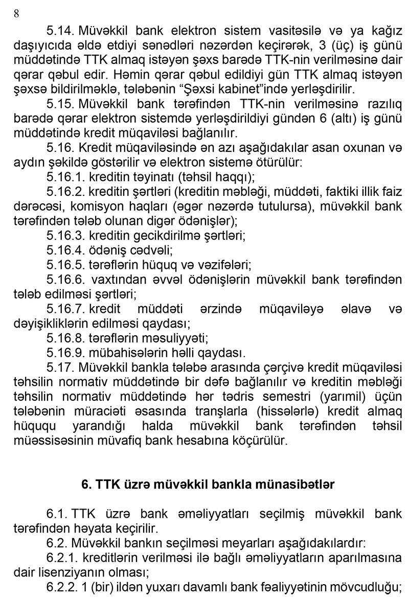 - Müvəkkil bank elektron sistem vasitəsilə və ya kağız daşıyıcıda əldə etdiyi sənədləri nəzərdən keçirərək, 3 (üç) iş günü müddətində TTK almaq istəyən şəxs barədə TTK-nin verilməsinə dair qərar qəbul edir. Həmin qərar qəbul edildiyi gün TTK almaq istəyən şəxsə bildirilməklə, tələbənin “Şəxsi kabinet”ində yerləşdirilir.