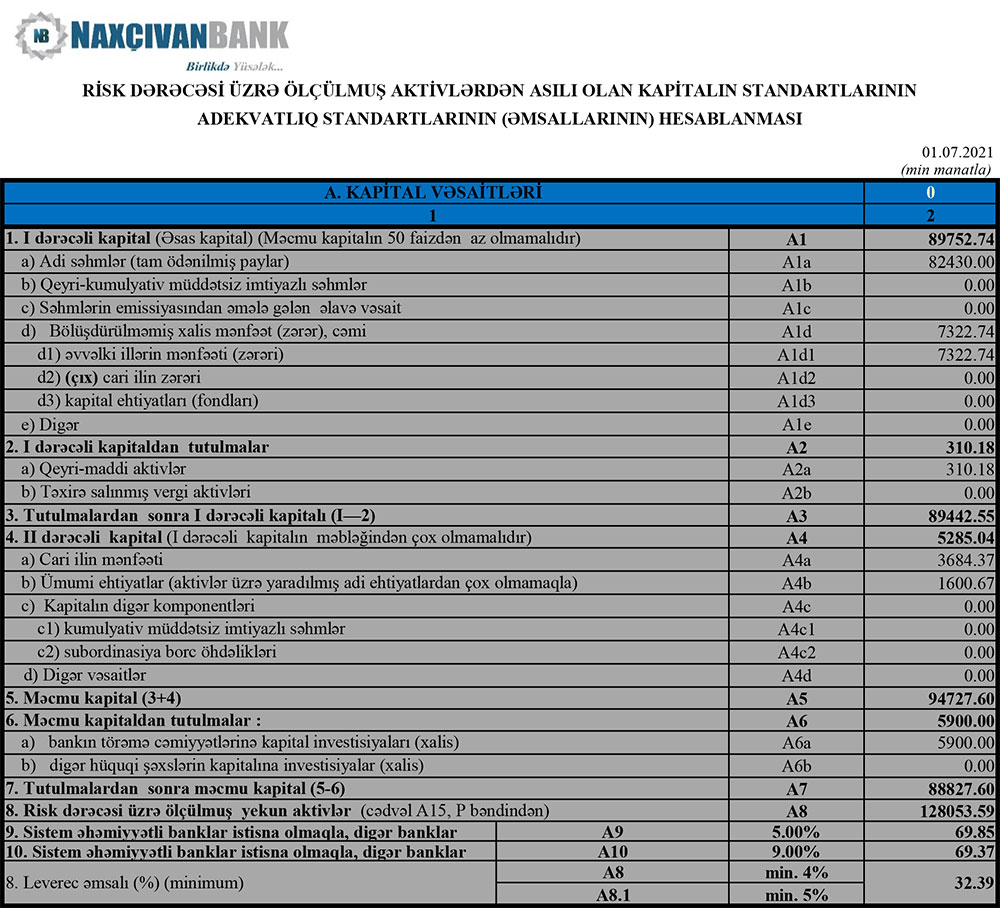 30 İyun 2021-ci il tarixində "Naxçıvanbank" 88 milyon 828 min manat məcmu kapitala malik olub.