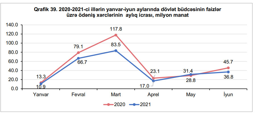 2021-ci ilin yanvar-iyun aylarında dövlət büdcəsinin faizlər üzrə ödəniş xərcləri 2020-ci ilin müvafiq dövrü ilə müqayisədə 20 faiz və ya 61,6 milyon manat azalaraq 246,2 milyon manat icra edilmişdir.