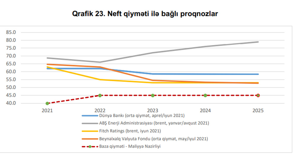 "Lakin, dövlət büdcəsinin layihəsinin tərtibi zamanı başqa qiymət əsas götürülə bilər. Neftin qiyməti ilə yanaşı, ortamüddətli dövr üçün manatın məzənnəsinin ABŞ dollarına nisbətdə sabit qalması (1,7 manat), neft yataqlarının işlənməsi və hasilatın pay bölgüsünə dair sazişlərin müddəti, hasilat həcmləri ilə bağlı beynəlxalq razılaşmalar, habelə ÜDM-in artım tempi ilə bağlı Azərbaycan Respublikası İqtisadiyyat Nazirliyinin proqnoz və hədəfləri, eləcə də vergi-gömrük siyasətinin təkmilləşdirilməsi ilə bağlı tədbirlər gəlirlərin proqnozlaşdırılması zamanı ehtimal və fərziyyələrin əsasını təşkil etmişdir”.