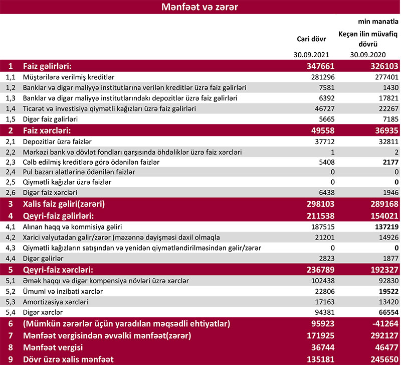“Kapital Bank” ASC 2021-ci ilin 9 ayını (yanvar-sentyabr dövrünü) 135 milyon 181 min manat xalis mənfəət ilə başa vurub. Bank 2020-ci ilin eyni dövrünü 245 milyon 650 min manat xalis mənfəət ilə bağlamışdı. Xalis mənfəətin azalması əməliyyat mənfəətinin bir hissəsinin mümkün zərərlər üçün yaradılan məqsədli ehtiyatlara ayırılması ilə əlaqədardır. Bu il Kapital Bankın müştərilərə verdiyi kredirlər, gəlirləri və əməliyyat mənfəəti artıb.