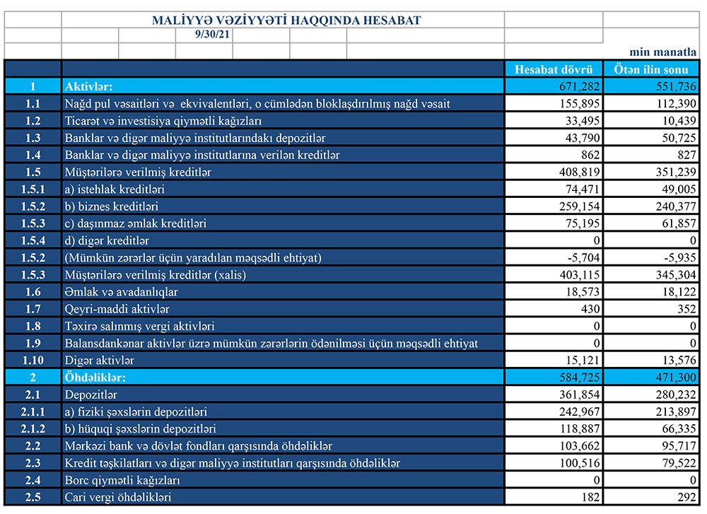 2020-ci ilin sonu ilə müqayisədə 2021-ci ilin 9 ayında “Turanbank”ın cəmi aktivləri 119 milyon 546 min manat və ya 21,7% artaraq 671 milyon 282 min manata, o cümlədən müştərilərə verilmiş kreditlər 57 milyon 580 min manat və ya 16,4% artaraq 408 milyon 819 min manata, qiymətli kağızlara investisiyalar 3,2 dəfə artaraq 33 milyon 495 min manata çatıb çatıb.