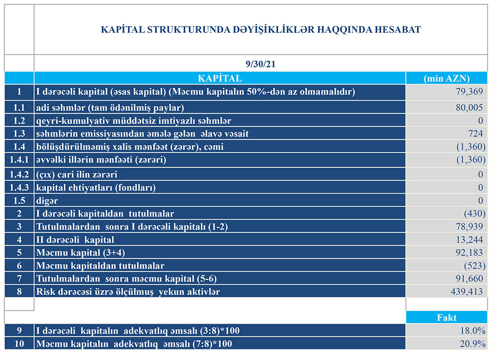 Müqayisə üçün qeyd edək ki, 2020-ci ilin yanvar-sentyabr dövründə “Turanbank”ın cəmi əməliyyat gəlirləri 30 milyon 111 min manat, cəmi əməliyyat xərcləri 28 milyon 419 min manat, əməliyyat mənfəəti 1 milyon 692 min manat təşkil etmişdi. Bank mümkün zərərlər üçün yaradılan məqsədli ehtiyata 278 min manat ayırdığından həmin dövrü 1 milyon 414 min manat xalis mənfəət ilə bağlamışdı.