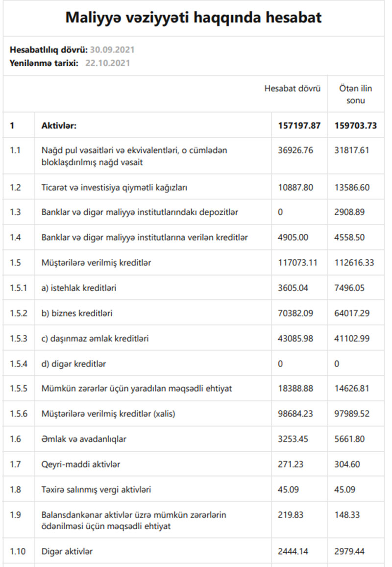 “Bank Avrasiya” tərəfindən müştərilər verilmiş cəmi kreditlər (kredit portfeli) 2021-ci ilin 9 ayında ötən ilin sonu ilə müqayisədə 4 milyon 456 min manat və ya 4% artaraq 117 milyon 73 min manata yüksəlib. Bank 2020-ci ilin sonunda 112 milyon 616 min manat cəmi cəmi kredit portfelinə malik idi.
