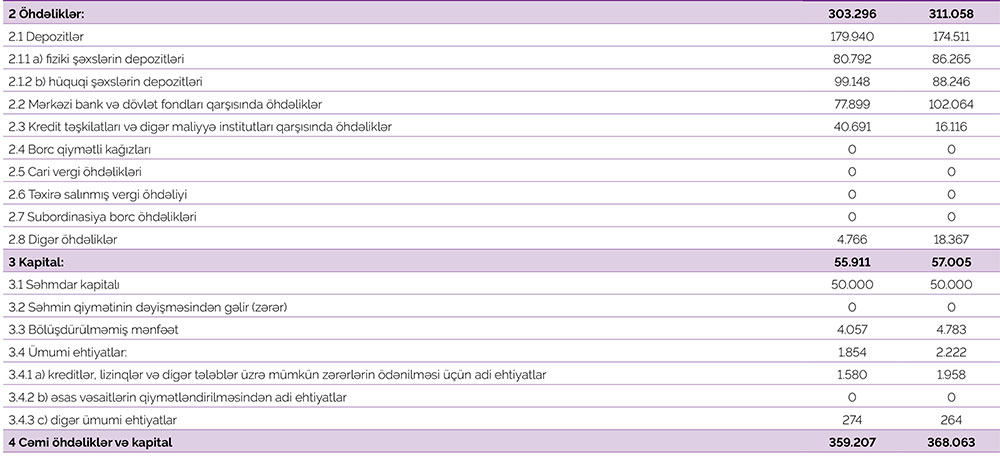 Cəmi bank öhdəliklərinin həcmi 5,5% artımla 311 milyon manat təşkil etmişdir.