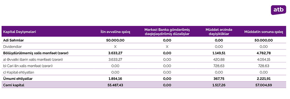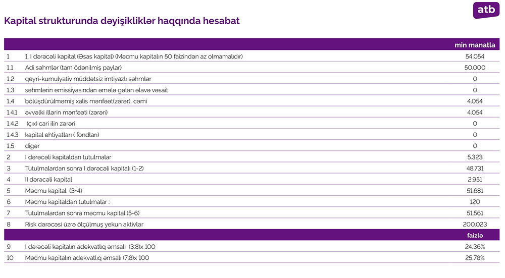 Press-relizdə qeyd edilib ki, məcmu kapitalın adekvatlığı 26%, leverec əmsalı 12,9% təşkil edir ki, bu da müəyyən edilmiş normadan yüksəkdir.