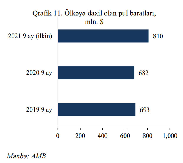 İlkin rəqəmlərə əsasən 2021-ci ilin 9 ayında ölkəyə daxil olan pul baratları 2020-ci ilin müvafiq dövrü ilə müqayisədə 18.8% artaraq 810 milyon ABŞ dolları təşkil edib.
