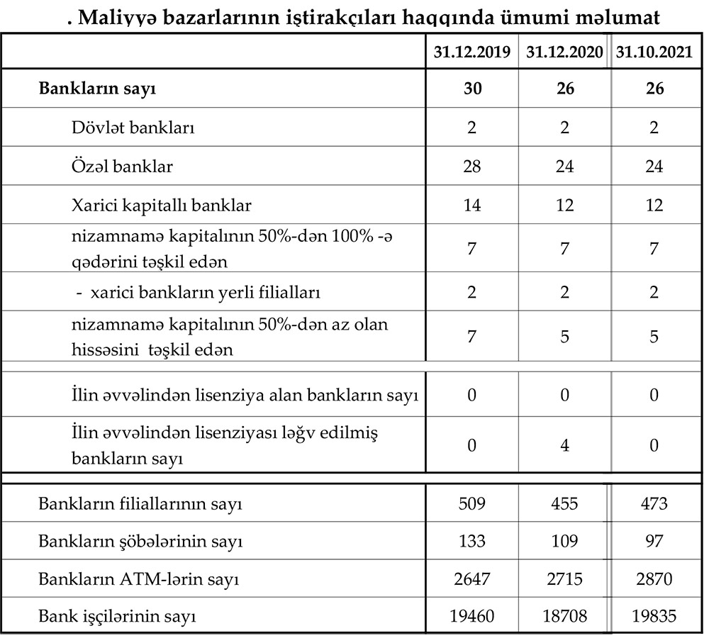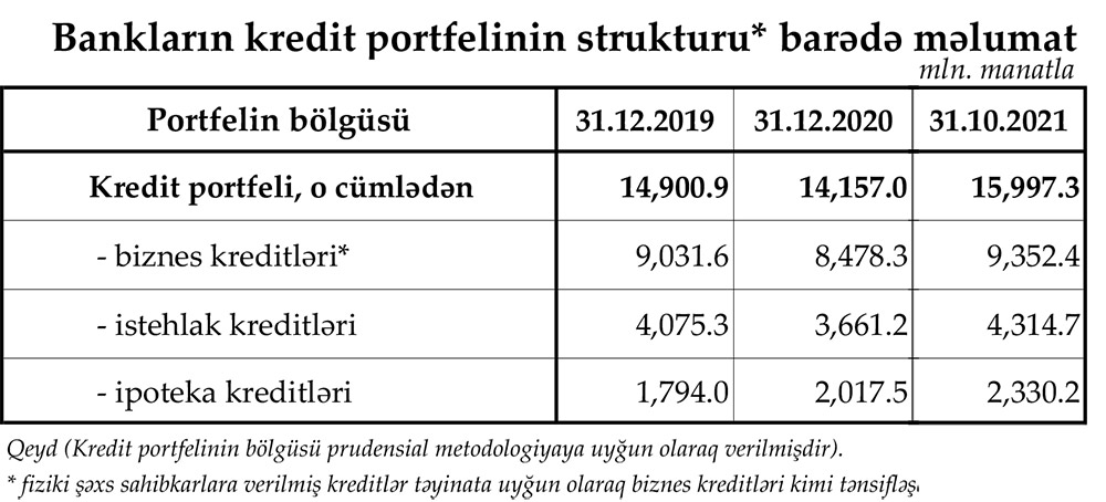 Hesabata görə, 31 Oktyabr 2021-ci il tarixində Azərbaycanın bank sektoru 34 milyard 963.6 milyon manat cəmi aktivlərə , o cümlədən 15 milyard 997.3 milyon manat müştərilərə verilmiş cəmi kreditlərə malik olub. Sektor 2020-ci ilin sonunda 32 milyard 55.3 milyon manat cəmi aktivlərə və 14 milyard 157 milyon manat kredit portfelinə malik idi. Beləliklə, 2021-ci ilin 10 ayında sektor 2 milyard 908.3 milyon manat böyüyüb, müştərilərə verilmiş cəmi kreditlər 1 milyard 840.3 milyon manat artıb.