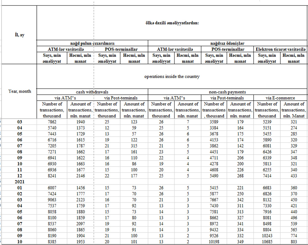 2021-ci ilin oktyabr ayında Azərbaycanda ödəniş kartları vasitəsilə 1 milyard 154 milyon manatlıq nağdsız ödənişlər həyata keçirilib. Sentyabrda nağdsız ödənişlərin cəmi məbləği 1 milyard 108 milyon manat olmuşdu.