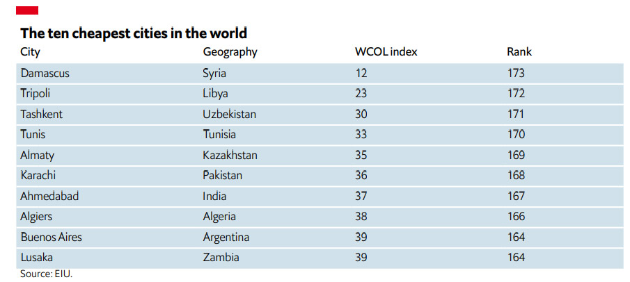 Dünyanın ən ucuz şəhərləri isə Dəməşq (Suriya),Tripoli (Liviya), Daşkənd (Özbəkistan), Tunis (Tunis), Almatı (Qazaxıstan), Kəraçi (Pakistan), Əhmədabad (Hindistan), Əlcəzair (Əlcəzair), Buenos Ayres (Argentina) və Lusakadır (Zambiya)
