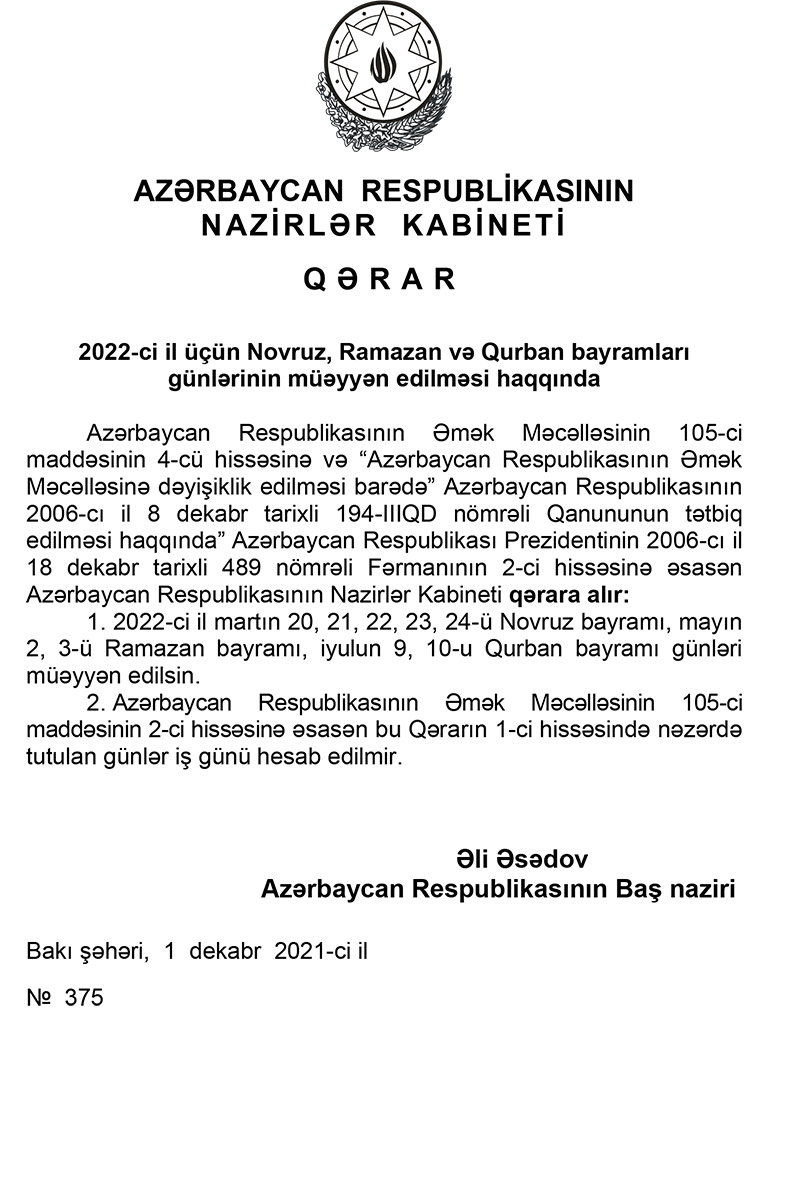 Qərara əsasən, 2022-ci il martın 20, 21, 22, 23, 24-ü Novruz bayramı, mayın 2, 3-ü Ramazan bayramı, iyulun 9, 10-u Qurban bayramı günləri müəyyən edilib.