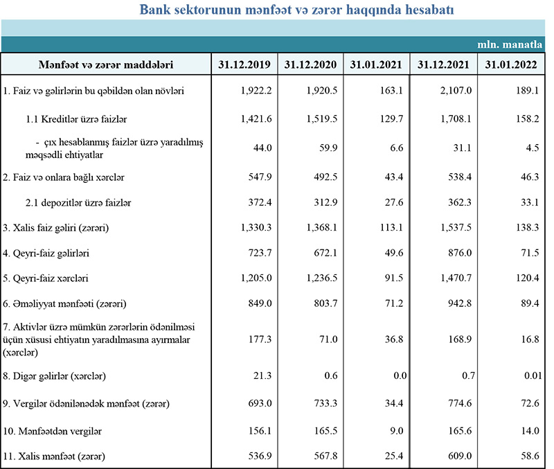Azərbaycanın bank sektoru 2022-ci ilin yanvar ayını 58.6 milyon manat xalis mənfəət ilə başa vurub.
