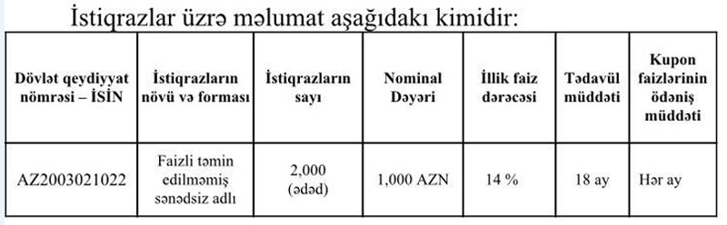 Faizli təmin edilməmiş sənədsiz adlı istiqrazlatın sayı 2000 ədəd, hər birinin nominal dəyəri 1000 manat, illik faiz dərəcəsi 14 %, tədavül müddəti 18 ay, kupon faizlərinin ödəniş müddəti hər aydır.
