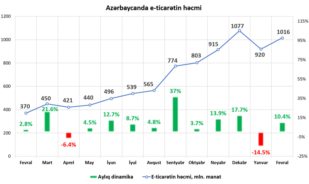 Cari ilin fevral ayında Azərbaycan əhalisi tərəfindən bank kartları ilə elektron ticarət (e-ticarət) şəbəkəsində 1 milyard 16 milyon manat həcmində ödəniş həyata keçirilib.