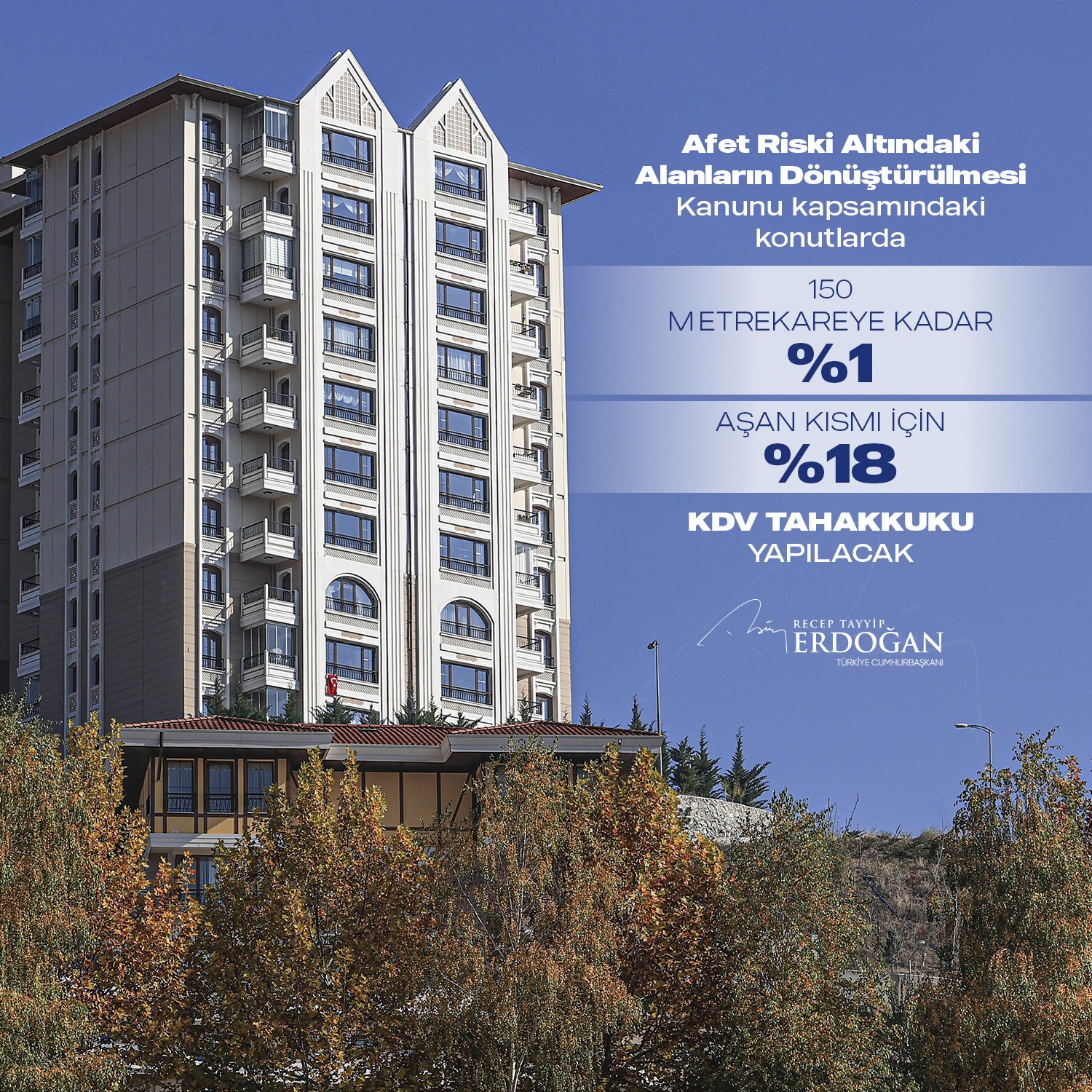 Həmçinin Ərdoğan "yaşayış yerləri və torpaqlar üzrə ƏDV-nin sadələşdirilməsi də işlərimizdən biridir. Müvafiq olaraq, alınan evin harada olmasından asılı olmayaraq, kvadrat metinə əsasən dəyişən ƏDV tətbiq ediləcək", bildirib.