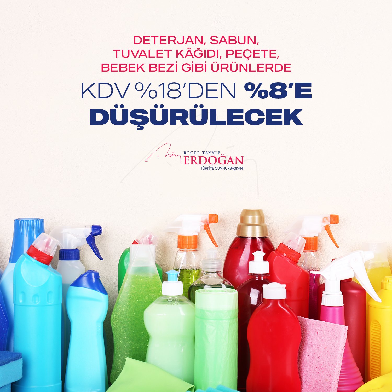 Prezident Ərdoğan Nazirlər Kabinetinin iclasından sonra verdiyi açıqlamada isə, "Yuyucu vasitə, sabun, tualet kağızı, salfet və uşaq bezləri kimi məhsulların ƏDV-sini 18%dən 8%-ə endirməyə qərar verdik. Bütün iaşə xidmətləri üçün ƏDV dərəcəsini 8 faiz səviyyəsində müəyyən etdik”, -deyib.