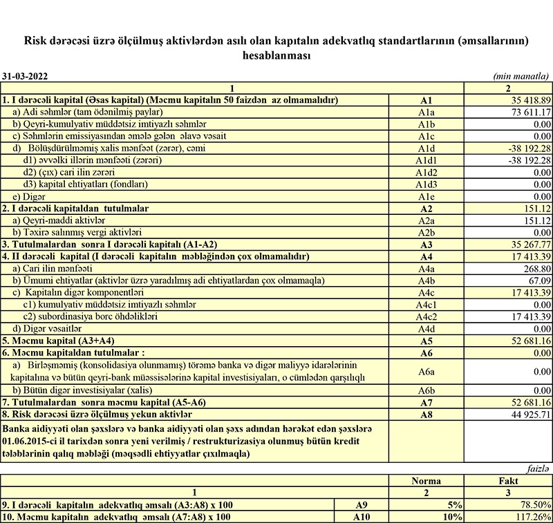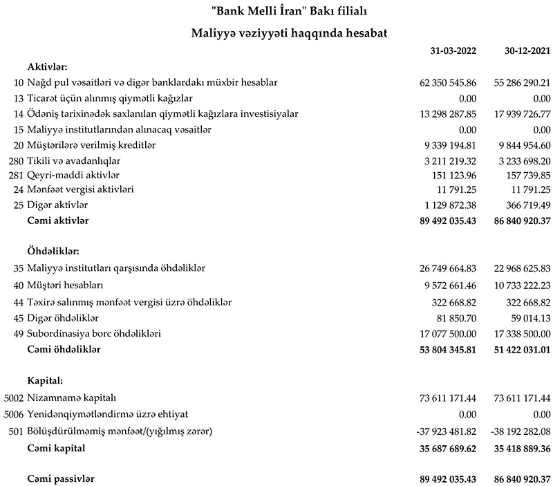 Xatırladaq ki, "Bank Melli İran" Bakı filialı 2021-ci ili 1 milyon 960 min manat xalis zərər ilə başa vurmuşdu.