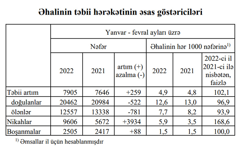 2022-ci ilin yanvar-fevral ayında Azərbaycan əhalisinin sayı 8 min 98 nəfər və ya 0,07 faiz artıb.