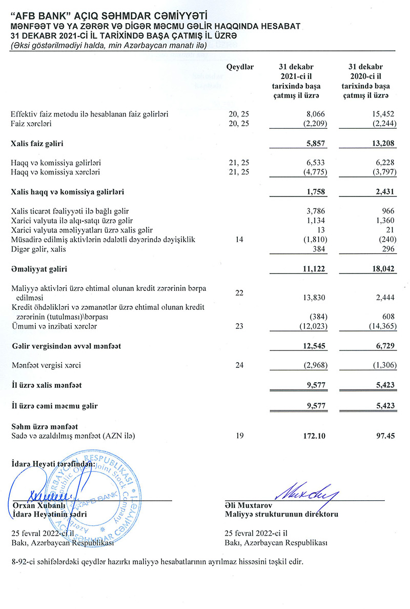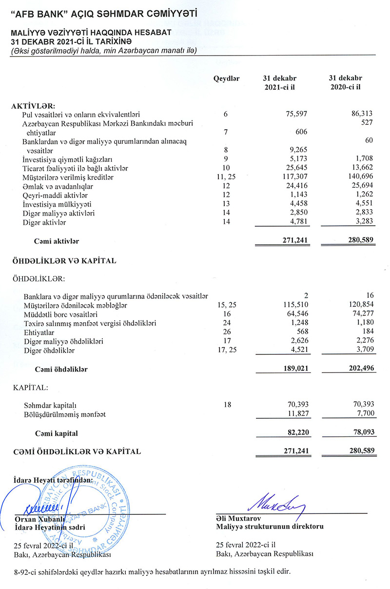 “AFB Bank” ASC 31 dekabr 2021-ci il tarixində başa çatmış il üzrə Maliyyə Hesabatlarının Beynəlxalq Standartlarına Uyğun Hazırlanmış maliyyə hesabatlarını və müstəqil auditorun rəyini dərc edib.