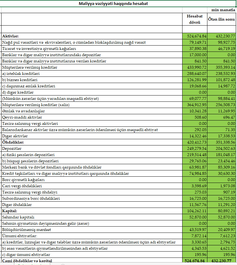 Xatırladaq ki, 2021-ci ilin 1-ci rübündə “Bank of Baku”nun cəmi əməliyyat gəlirləri 17 milyon 359 min manat, cəmi əməliyyat xərcləri 13 milyon 174 min manat, əməliyyat mənfəəti 4 milyon 185 min manat təşkil etmişdi. Ehtiyatdan azad olmuş 715 min manat mənfəətə əlavə edilmiş və Bank 4 milyon 900 min manat mənfəətindən 790 min manat mənfəət vergisi ödəmişdi.