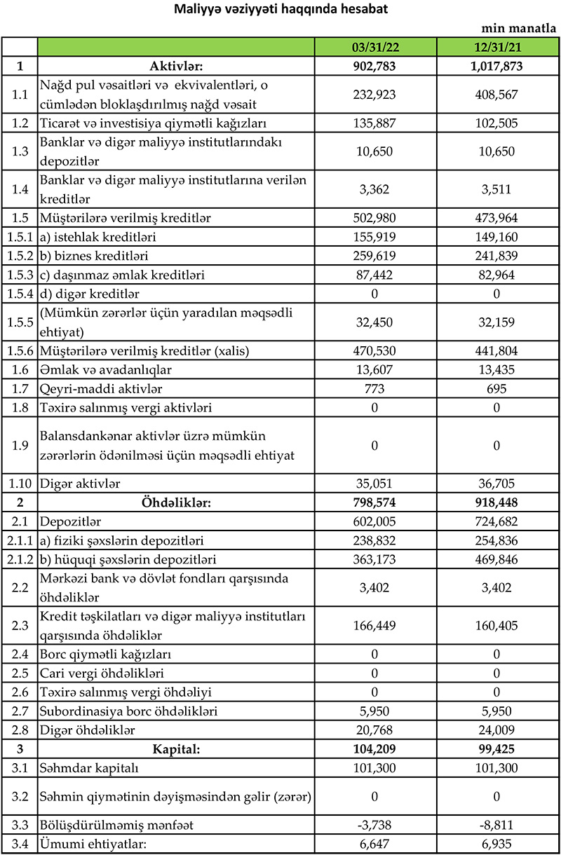 31 Mart 2022-ci il tarixində “Rabitəbank” 902 milyon 783 min manat cəmi aktivlərə, o cümlədən 502 milyon 979 min manat kredit portfelinə (müştərilərə verilmiş kreditlər) malik olub. Xatırladaq ki, 31 Dekabr 2021-ci il tarixində “Rabitəbank” 1 milyard 17 milyon 872 min manat cəmi aktivlərə, o cümlədən 473 milyon 963 min mantat kredit portfelinə malik idi (ilk 3 ayda Bankın kredit portfeli 29 milyon 16 min manat və ya 6,1% artıb). Aktivlərin azalmasının əsas səbəbi şirkətlərin cari hesablarındakı vəsaitlərinin azalması ilə əlaqədar olaraq nağd pul vəsaitlərinin azalmasıdır. Bankın depozit portfeli 122 milyon 677 min manat və ya 17% azalaraq 602 milyon 5 min manata, o cümlədən hüquqi şəxslərin depozitləri 106 milyon 673 min manat və ya 22,7% azalaraq 363 milyon 172 min manata geriləyib.