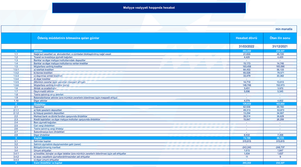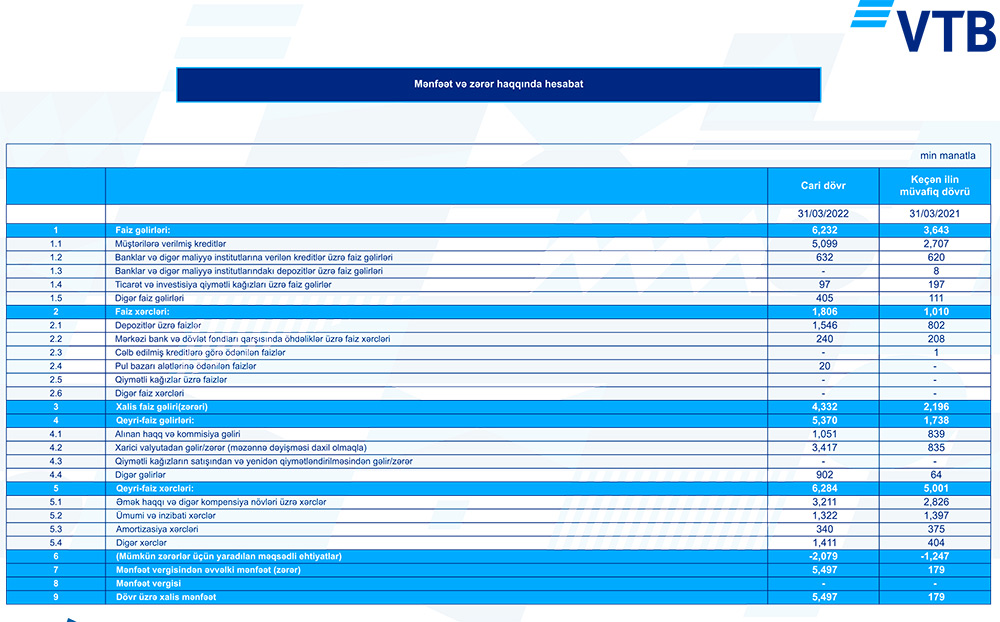 Qeyd edilib ki, bank hesabat dövründə 3.4 milyon manat həcmində əməliyyat mənfəəti əldə edib. Bankın xalis mənfəəti ötən ilin müvafiq dövrü ilə müqayisədə artaraq birinci rübün sonuna 5.5 milyon manat təşkil edib.