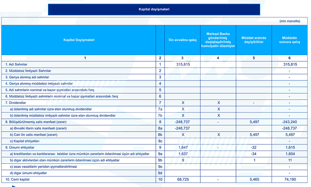 Bankın kapitalı ilin əvvəlindən 8% artaraq hesabat dövrünün sonuna 74.2 milyon manat təşkil edib.
