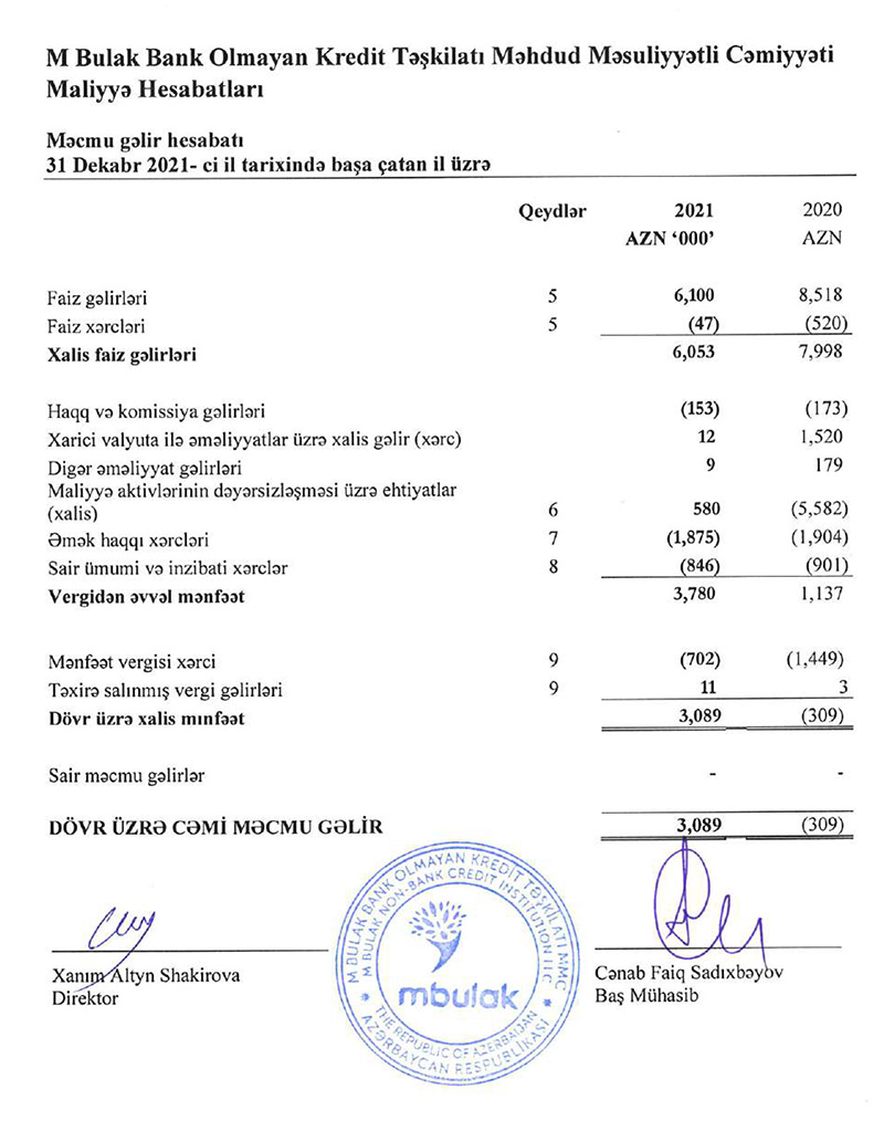 "M Bulak Bank Olmayan Kredit Təşkilatı" MMC 2021-ci ili 3 milyon 89 min manat xalis mənfəət ilə başa vurub. Halbuki, təşkilat 2020-ci ili 309 min manat xalis zərər ilə bağlamışdı. Bunun səbəbi ehtiyatlara 5 milyon 582 min manat ayrılması idi. 2021-ci ildə isə, əksinə, ehtiyatdan azad olmuş 580 min manat mənfəətə əlavə edilib.