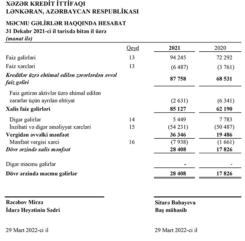 Lənkəranda fəaliyyət göstərən “Xəzər”Kredit İttifaqı 2021-ci ili 28 min 408 manat xalis mənfəət ilə başa vurub. Halbuki, ittifaq 2020-ci ili 17 min 826 manat xalis mənfəəət ilə bağlamışdı. Beləliklə, “Xəzər”Kredit İttifaqının xalis mənfəəti 2020-ci illə müqayisədə 2021-ci ildə 59,4% artıb.