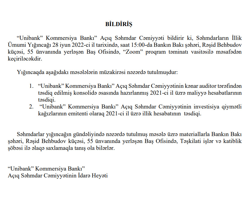 28 iyun 2022-ci il tarixində “Unibank” Kommersiya Bankı” ASC səhmdarlarının yığıncağı keçiriləcək.