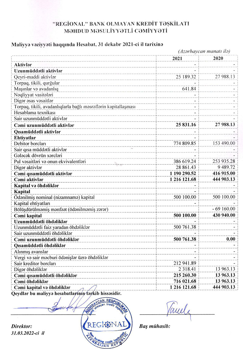 “Regional” BOKT MMC 2021-ci ili 52 min 271 manat xalis mənfəət ilə başa vurub. BOKT 2020-ci ili 3 min 580 manat xalis zərər ilə bağlamışdı.