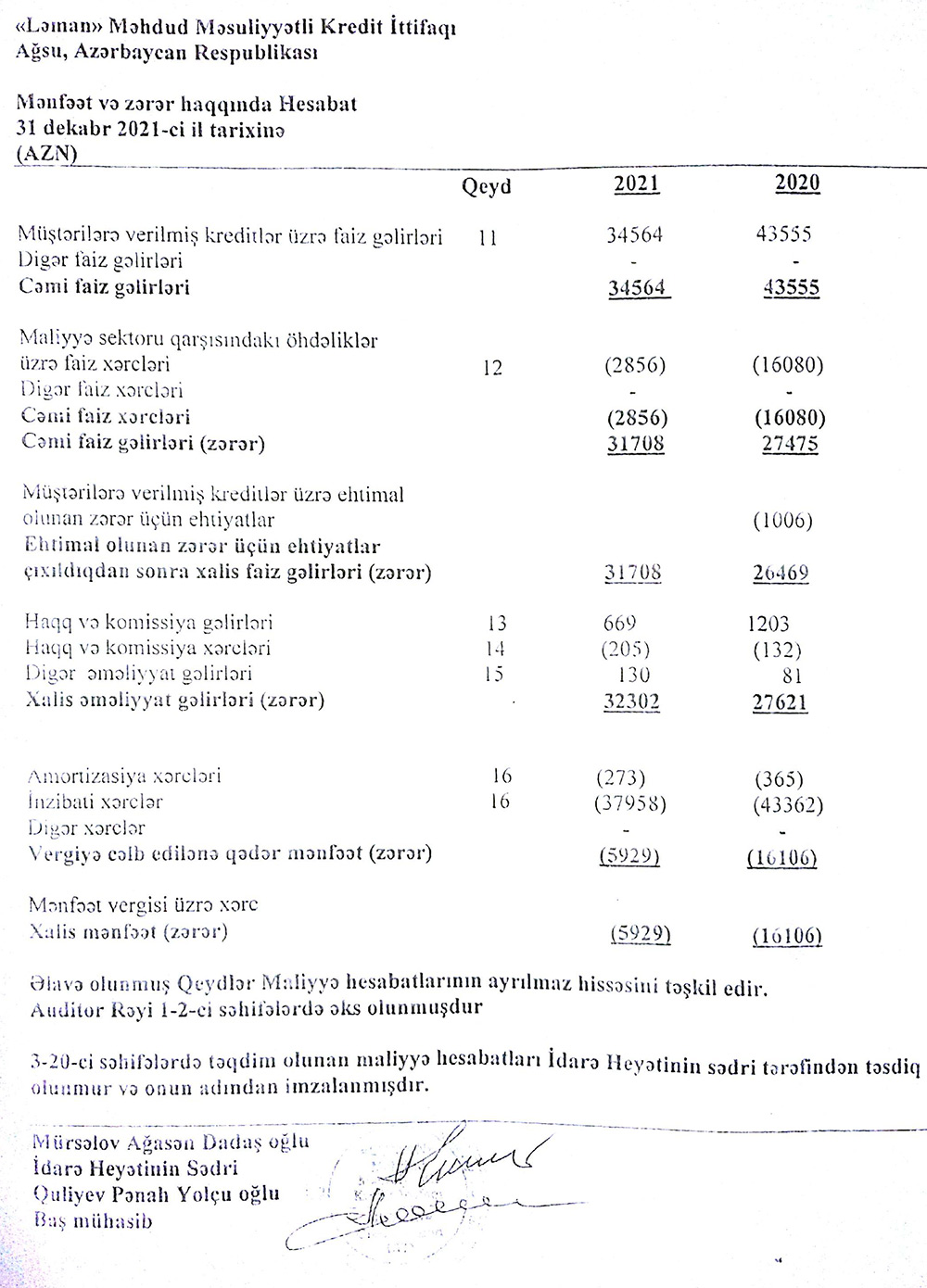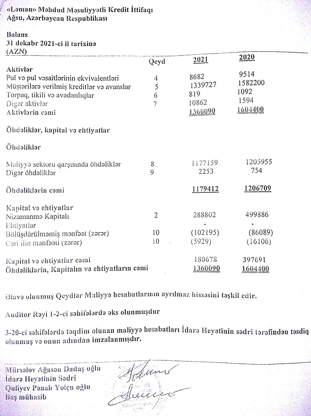 Ağsu rayonunda fəaliyyət göstərən "Ləman" Məhdud Məsuliyyətli Kredit İttifaqı 31 dekabr 2021-ci il tarixinə maliyyə göstəricilərini təqdim edir.