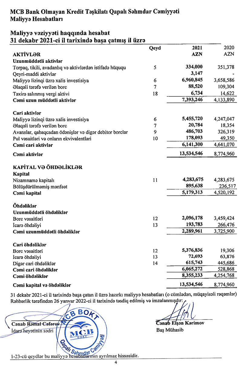Marja.az təşkilatın audit olunmuş hesabatlarına istinadən xəbər verir ki, “MCB BOKT”un 2020-ci ildə maliyyə lizinqi üzrə faiz gəlirləri 1 milyon 718 min 353 manat ikən, 2021-ci ildə 1 milyon 839 min 594 manat təşkil edib (7% artıb).