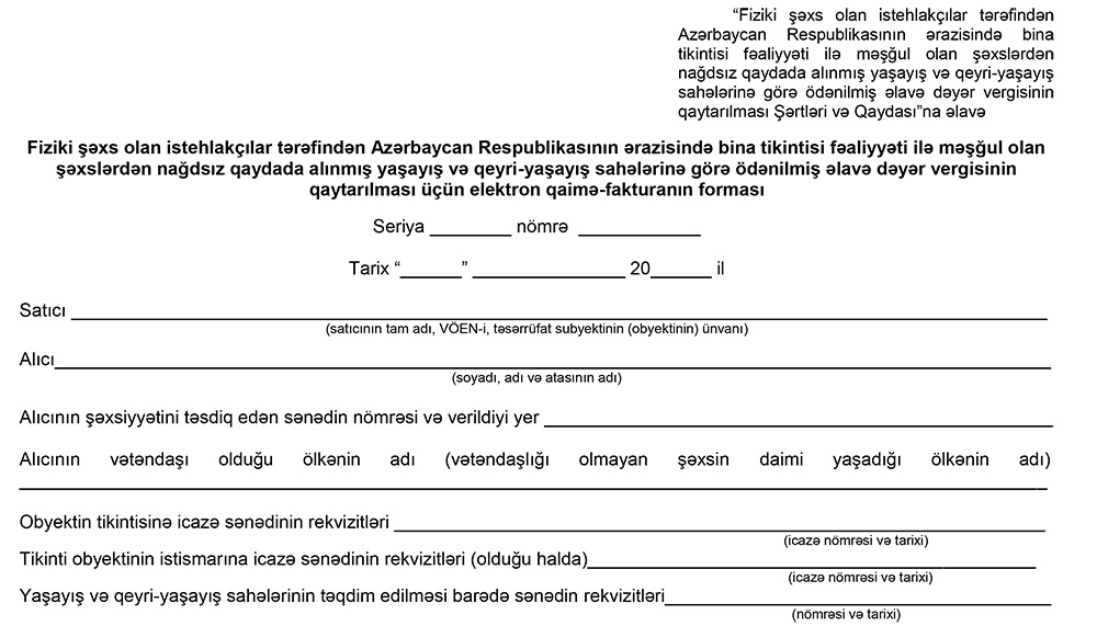 Qeyd edilib ki Qaydanın tələbləri bina tikintisi fəaliyyəti ilə məşğul olan şəxslərdən nağdsız qaydada alınmış yaşayış və qeyri-yaşayış sahələrinə görə təqdim edilmiş elektron qaimə-faktura üzrə yaşayış və qeyri-yaşayış sahələrinin qiymətindən (ƏDV ilə birlikdə) asılı olmayaraq tətbiq edilir.