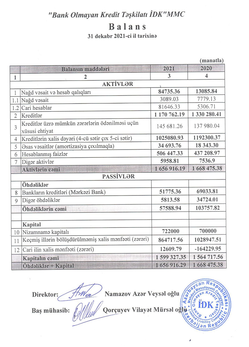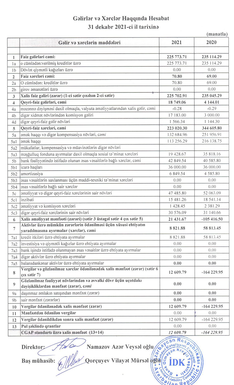 "İnkişafa Dəstək Krediti Bank Olmayan Kredit Təşkilatı" MMC (İDK BOKT) 2021-ci ili