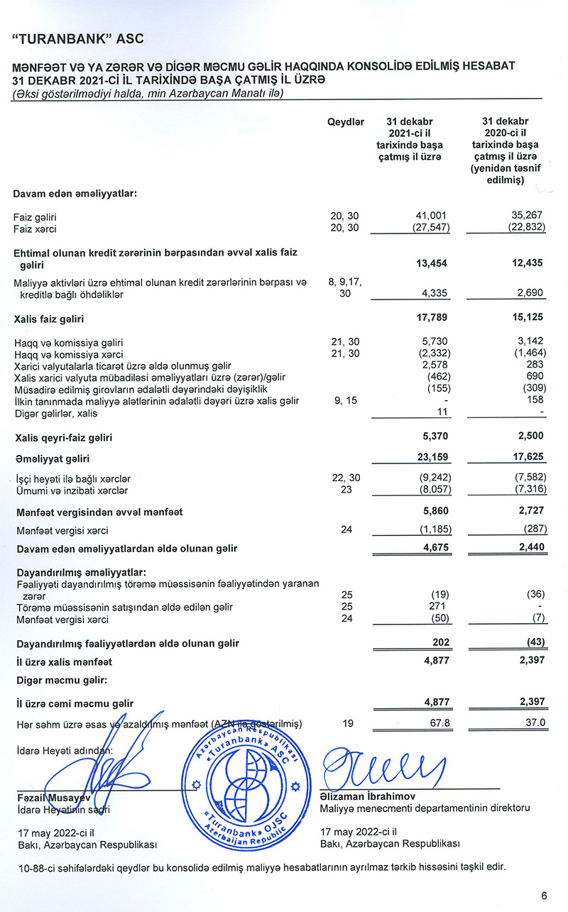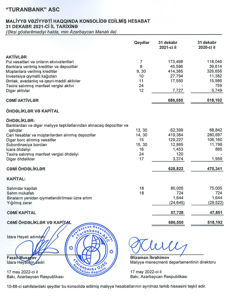 “Turanbank” ASC 31 dekabr 2021-ci il tarixində başa çatmış il üzrə Beynəlxalq Maliyyə Hesabatları Standartlarına uyğun Hazırlanmış Konsolidə edilmiş Maliyyə Hesabatları və Müstəqil Auditorların Rəyini öz İnternet saytında yerləşdirib.
