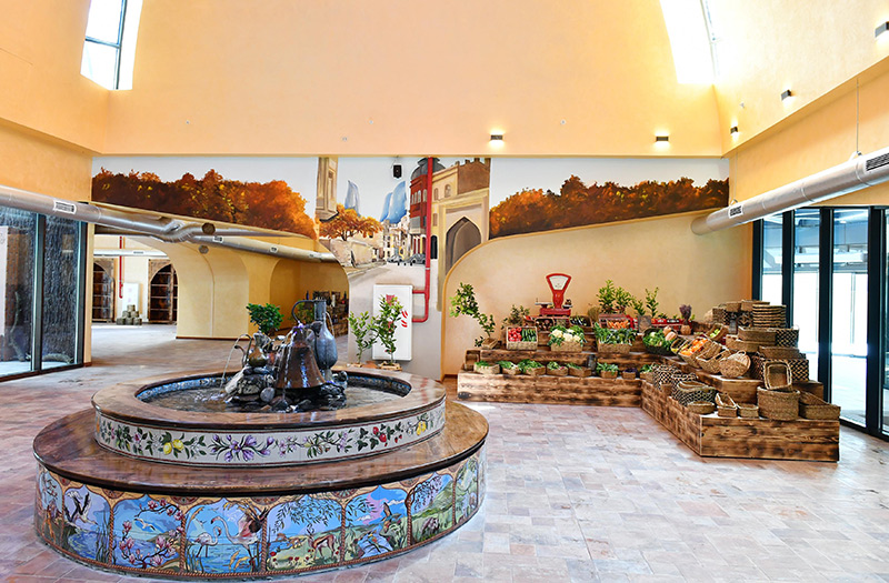 “Şərq Bazarı”nın girişində kiril əlifbası ilə yazılmış orijinal yazı eyni kalliqrafiya inkişaf etdirilərək latın əlifbasına dəyişdirilib, daxildəki işarə və başlıqlar bazarın üslubuna uyğun yenidən dizayn olunub.