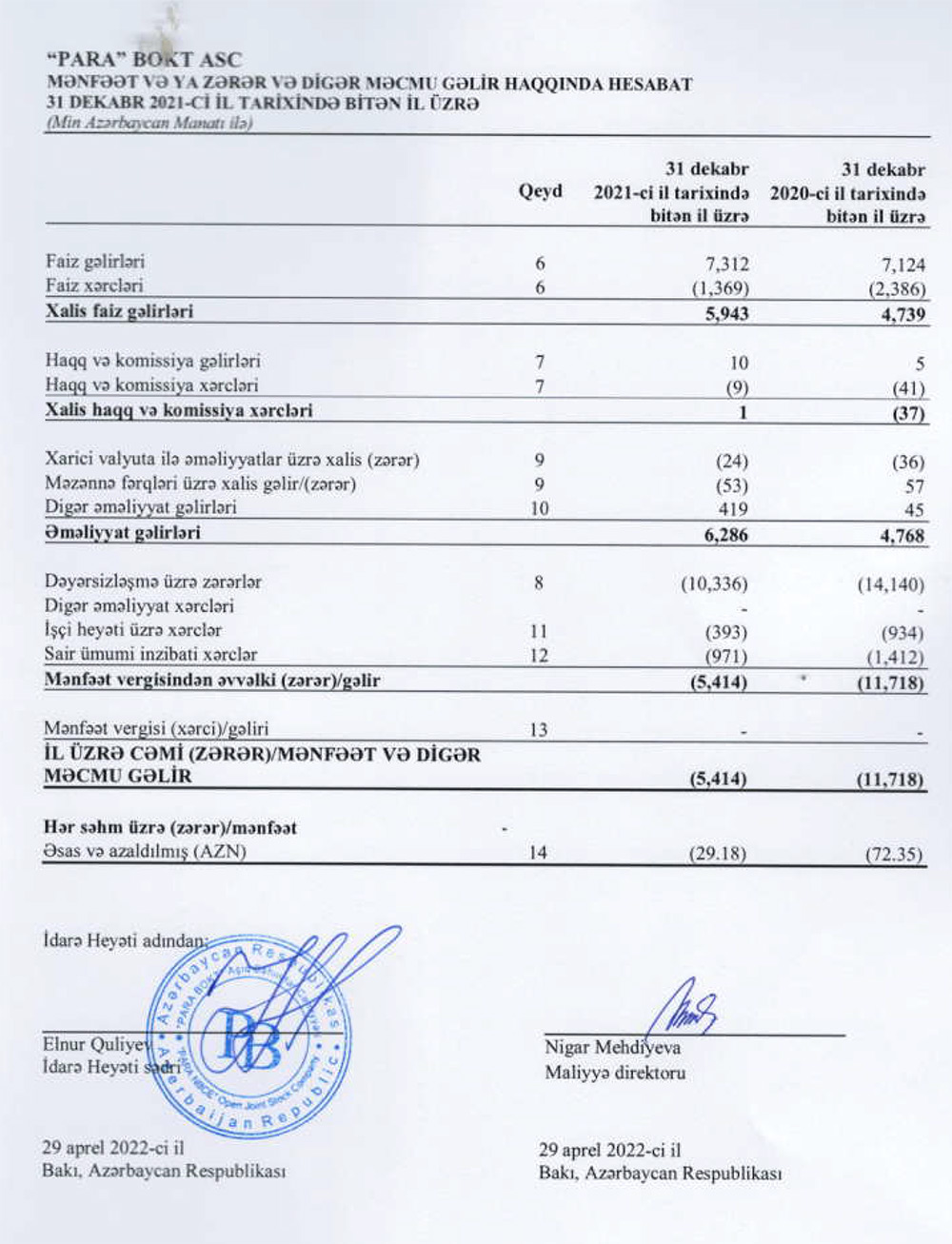 Marja.az təşkilatın maliyyə hesabatlarına istinadən xəbər verir ki, yığılmış zərər "Para BOKT"un 29 milyon 266 min manat nizamnamə kapitalını silib. 2021-ci ilin sonunda təşkilatın cəmi kapitalı mənfi 15 milyon 69 min manat olub. 2020-ci ilin sonunda bu rəqəm mənfi 9 milyon 655 min manat idi.