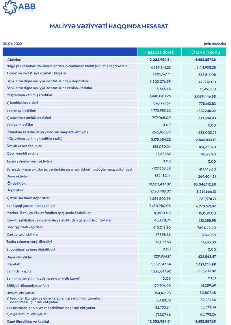 2022-ci ilin yanvar-iyun dövründə “ABB” ASC-nin cəmi əməliyyat gəlirləri (faiz və qeyri-faiz gəlirləri) 335 milyon 496 min manat, cəmi əməliyyat xərcləri (faiz və qeyri-faiz xərcləri) 160 milyon 491 min manat, gəlirlər xərcləri üstələdiyindən əməliyyat mənfəəti 175 milyon 5 min manat təşkil edib. Bank əməliyyat mənfəətindən mümkün zərərlər üçün yaradılan məqsədli ehtiyatlara 35 milyon 372 min manat ayırıb və 21 milyon 216 min manat mənfəət vergisi hesablanıb.