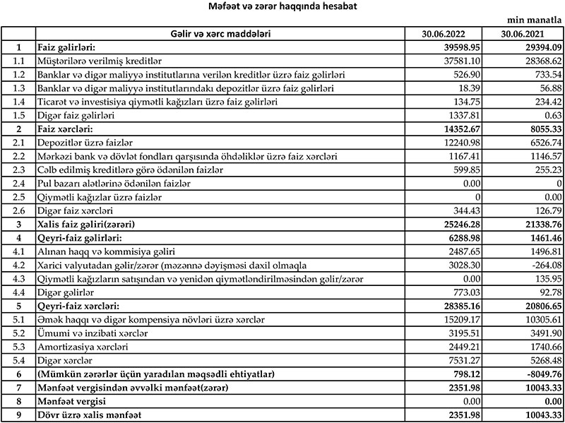 Müqayisə üçün qeyd edək ki, 2021-ci ilin birinci yarısında "Yelo Bank" ASC-nin cəmi əməliyyat gəlirləri 30 milyon 855 min manat, cəmi əməliyyat xərcləri 28 milyon 862 min manat, gəlirlər xərcləri üstələdiyindən əməliyyat mənfəəti 1 milyon 993 min manat təşkil etmişdi. Ehtiyatdan azad olmuş 8 milyon 50 min manatın hesabına mənfəət 10 milyon 43 min manata yüksəlmişdi.