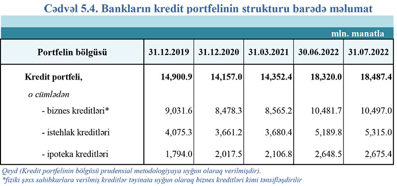 2022-ci ilin 7 ayı ərzində bank sektorunun cəmi kredit portfeli 1 milyard 828.3 milyon manat, o cümlədən biznes kreditləri 757 milyon manat, istehlak kreditləri 796.6 milyon manat, ipoteka kreditləri isə 274.7 milyon manat artıb.