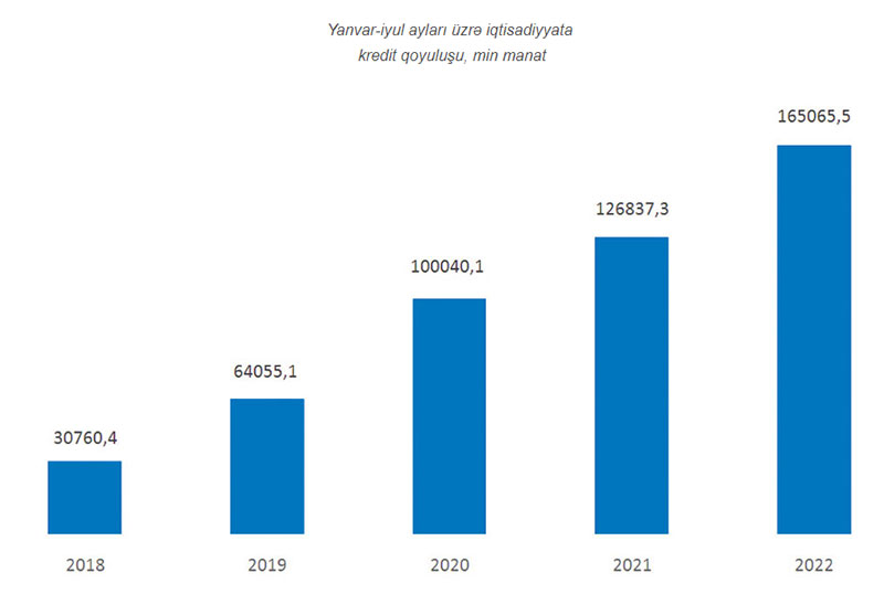 2022-ci ilin yanvar-iyul aylarında muxtar respublikanın bank və kredit təşkilatları tərəfindən hüquqi və fiziki şəxslərə 165 milyon 65 min 500 manat məbləğində kreditlər verilmişdir ki, bu da 2018-ci ilin müvafiq dövründəki göstəricidən 5,4 dəfə çoxdur.