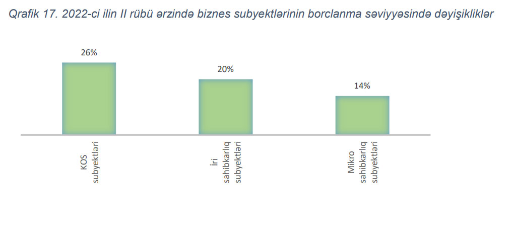 Biznes sektorunun maliyyə vəziyyətinin dəyərləndirilməsi məqsədilə biznes subyektlərinin borclanma səviyyəsinin cari ilin ikinci rübündə dəyişiklikləri də sorğuda əhatə edilmişdir. Sorğu nəticələrinə əsasən biznes subyektlərinin borclanma səviyyəsi artmışdır (xüsusilə KOS subyektləri üzrə) . Ötən rüb ilə müqayisədə II rüb ərzində iri sahibkarlıq subyektləri üzrə borclanma səviyyəsi daha çox artmışdır.