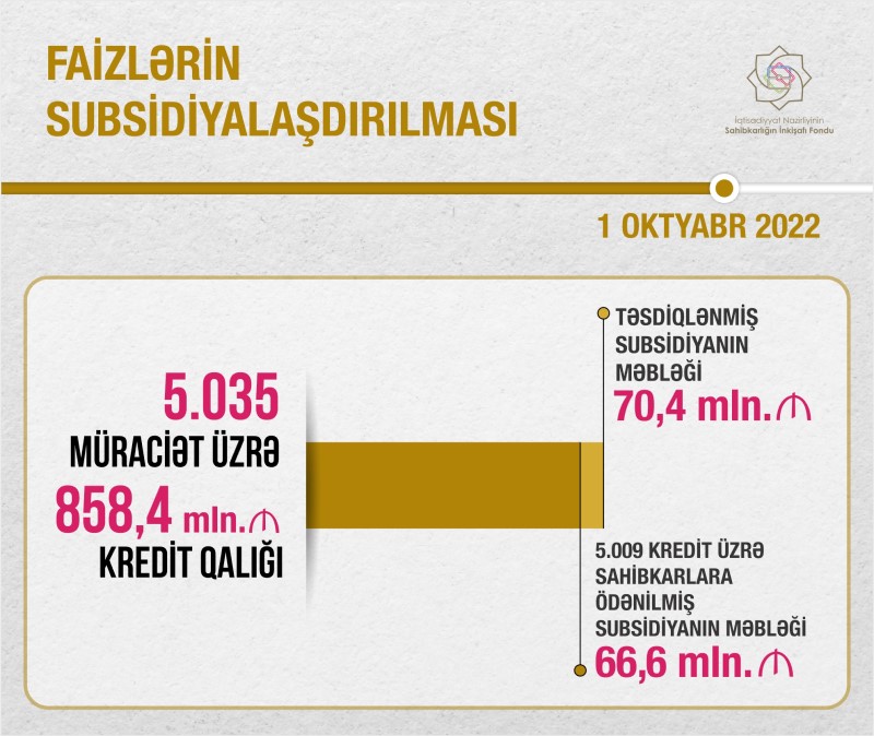 1 oktyabr 2022-ci il tarixinə mövcud kreditlər üzrə faizlərin subsidiyalaşdırılması mexanizmi ilə əlaqədar kredit qalığı 858,4 milyon manat olan 5035 müraciətə baxılaraq 70,4 milyon manat faiz subsidiyasının verilməsi barədə qərarlar qəbul edilib.