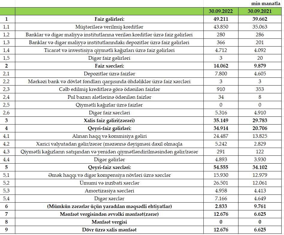 Marja.az xəbər verir ki, 2021-ci ilin yanvar-sentyabr dövründə "Rabitəbank"ın faiz gəlirləri 39 milyon 662 min manat ikən, 2022-ci ilin 9 ayında 49 milyon 211 min manata yüksəlib (24% və ya 9 milyon 549 min manat artıb). Bankın qeyri-faiz gəlirləri isə 20 milyon 706 min manatdan 34 milyon 914 min manata qalxıb (68,6% və ya 14 milyon 208 min manat artıb).