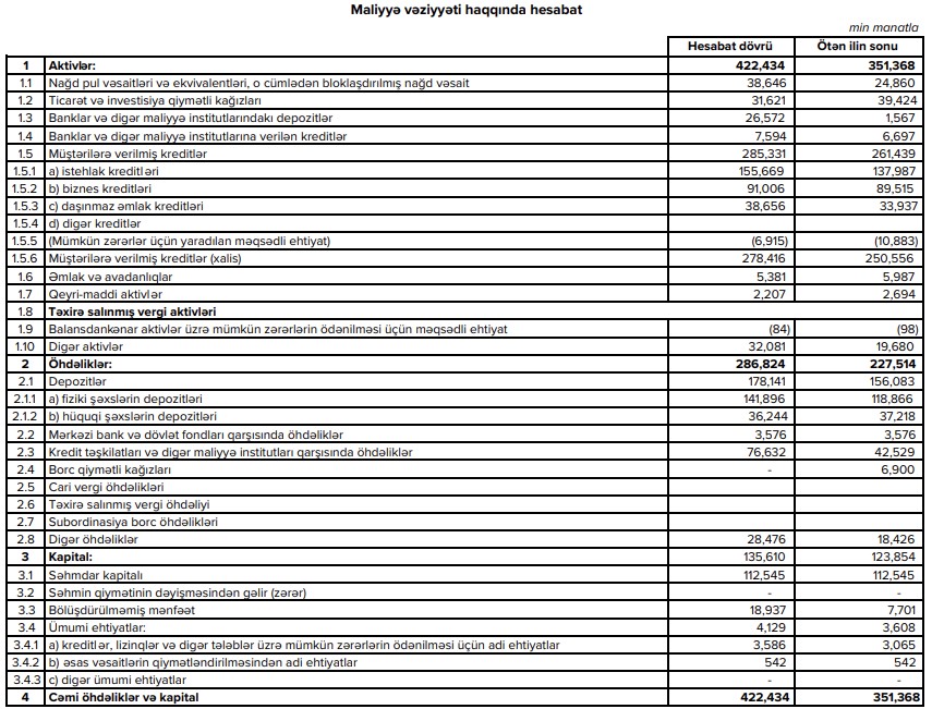 Press-relizdə qeyd edilib ki, 2022-ci ilin üçüncü rübünə aid olan maliyyə hesabatında bankın bir çox göstəricilərində uğurlu nəticələr qeydə alınmış və bu özünü aktivlərin həcmində də əks etdirmişdir. Belə ki, bankın aktivləri ötən ilin sonu ilə müqayisədə 20.23% artaraq cari ilin üçüncü rübündə 422 milyon 434 min manat təşkil etmişdir.
