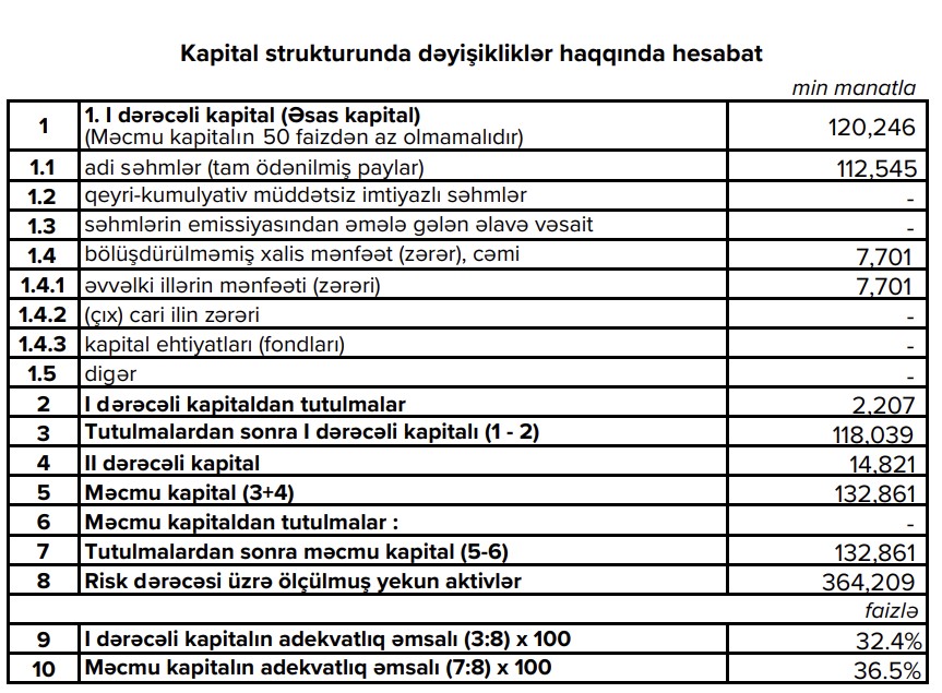 "Əlavə olaraq qeyd etmək istərdik ki, bankın məcmu kapitalı üçüncü rüb üzrə 132 milyon 861 min manat həcmində olmuşdur. Bu göstərici Mərkəzi Bankın müəyyən etdiyi normadan 3 dəfədən çox olmuşdur. Bu da bankın maliyyə cəhətdən stabil və inkişafa meyilli olduğunun bariz nümunəsidir",- press-relizdə bildirilir.